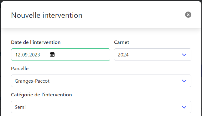 Agrobook vous permet de renseigner la date d’intervention ainsi que l’année du carnet concernée. Ainsi, vous pouvez librement ventiler vos interventions dans le carnet de l’année de votre choix.